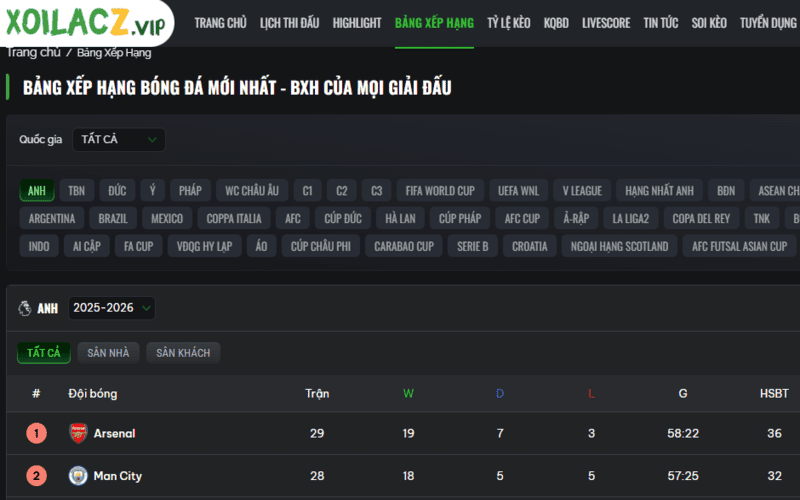 BXH tại Xôi Lạc TV – Cập nhật đầy đủ từng vòng đấu