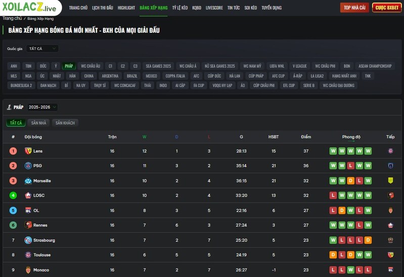 Cá nhân mình khá thích Ligue 1, nên bảng xếp hạng bóng đá Pháp là mục mình truy cập nhiều nhất trên Xoilac. Tại đây, thứ hạng các đội bóng ở Ligue 1 được hiển thị đầy đủ và rõ ràng, từ nhóm dẫn đầu cho đến những đội đang phải vật lộn ở cuối bảng. Việc theo dõi cuộc đua của PSG, Marseille, Monaco, Lyon hay những đội bóng giàu tham vọng khác trở nên rất thuận tiện. Chỉ cần nhìn vào bảng xếp hạng là mình đã thấy rõ khoảng cách điểm giữa các đội, biết đội nào đang bám đuổi sát sao và đội nào có dấu hiệu hụt hơi sau vài vòng đấu.
